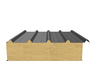Толщина кровельных сэндвич-панелей варьируется от 50 до 300 мм, что позволяет выбрать оптимальное решение под регион эксплуатации и особенности объекта. Утеплитель из минеральной ваты обеспечивает надёжную тепло- и звукоизоляцию, а жесткие внешние оцинкованные металлические листы с антикоррозийным полимерным покрытием устойчивы к влаге, ультрафиолету и механическим повреждениям. Специальный профиль верхнего листа формирует дополнительное ребро жёсткости и улучшает водоотвод, препятствуя застою осадков на крыше.